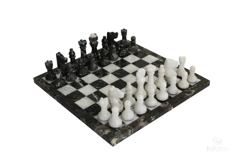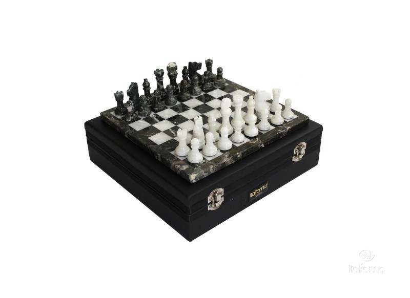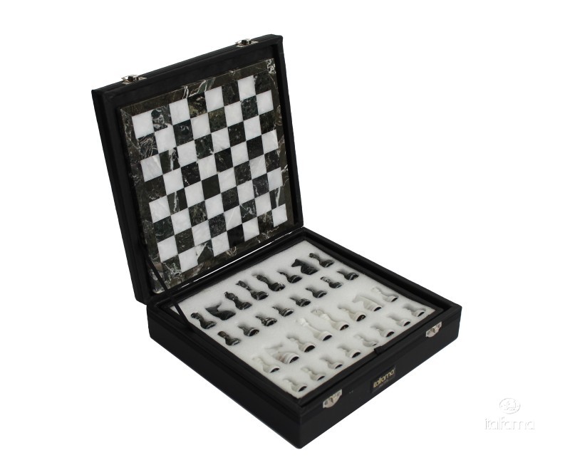 Scacchi in Marmo nero e bianco scolpiti a mano Re: ht 5,4 cm + Scacchiera in Marmo bianco e nero, lavorata a mano 23x23x1cm , valigia in similpelle inclusa