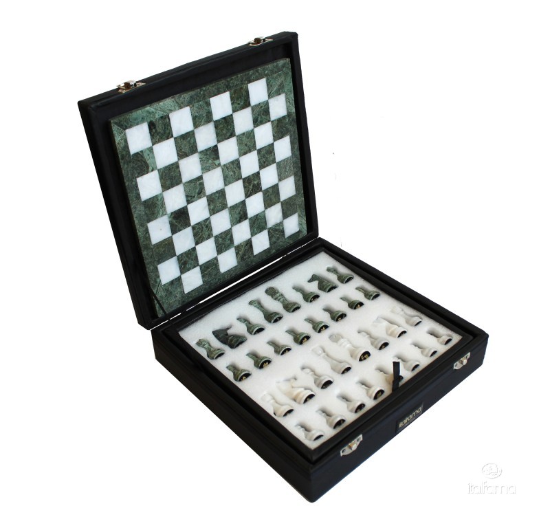 Scacchi in Marmo verde e bianco scolpiti a mano Re: ht 5,4 cm + Scacchiera in Marmo bianco e verde, lavorata a mano 23x23x1cm , valigia in similpelle inclusa