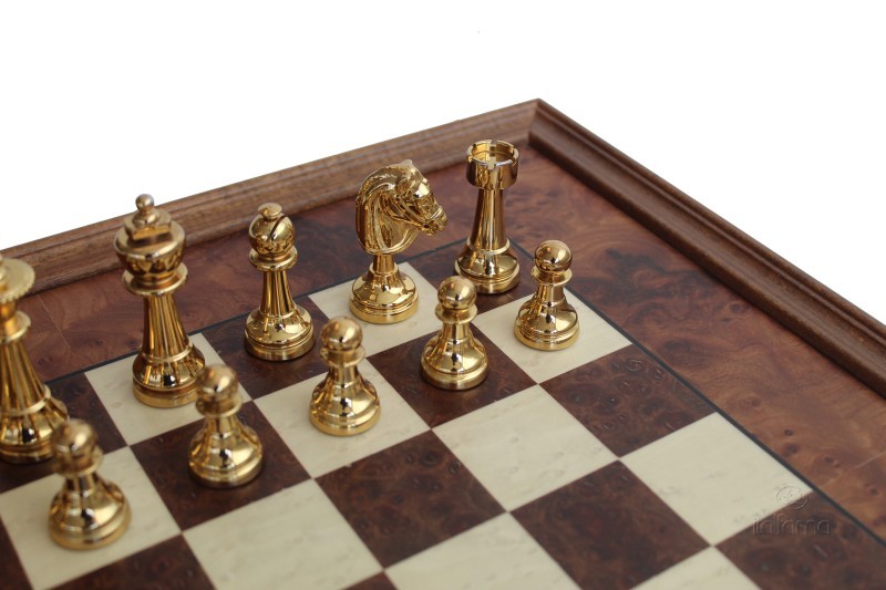 Scacchi in Metallo Dorati e Agentati + Scacchiera in Radica di Olmo, intarsiata