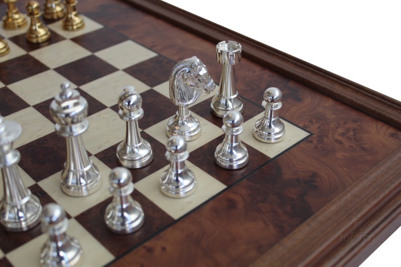 Scacchi in ottone bagnato oro/argento + Scacchiera in radica di olmo con cornice